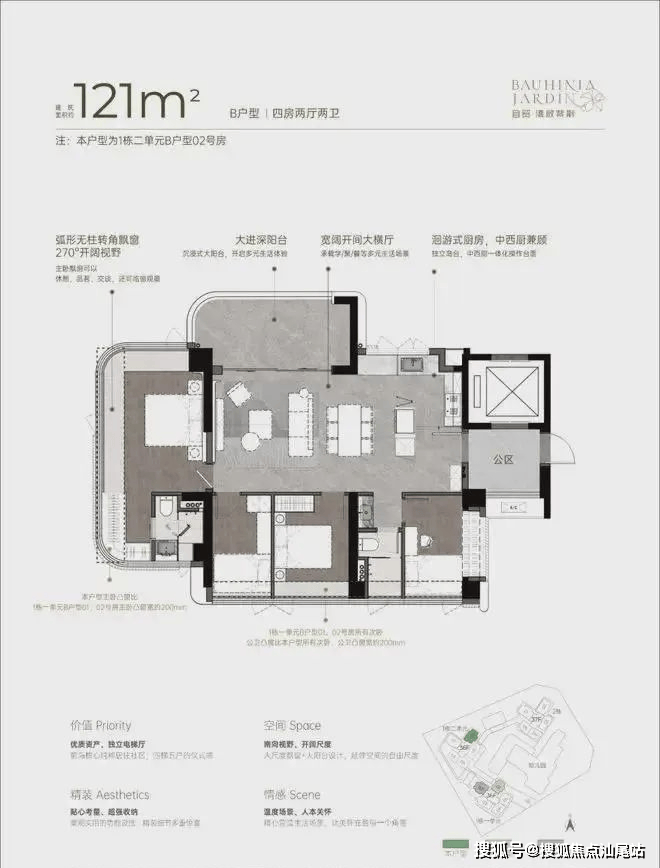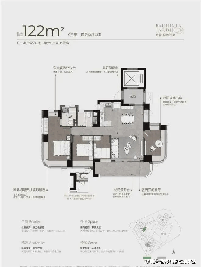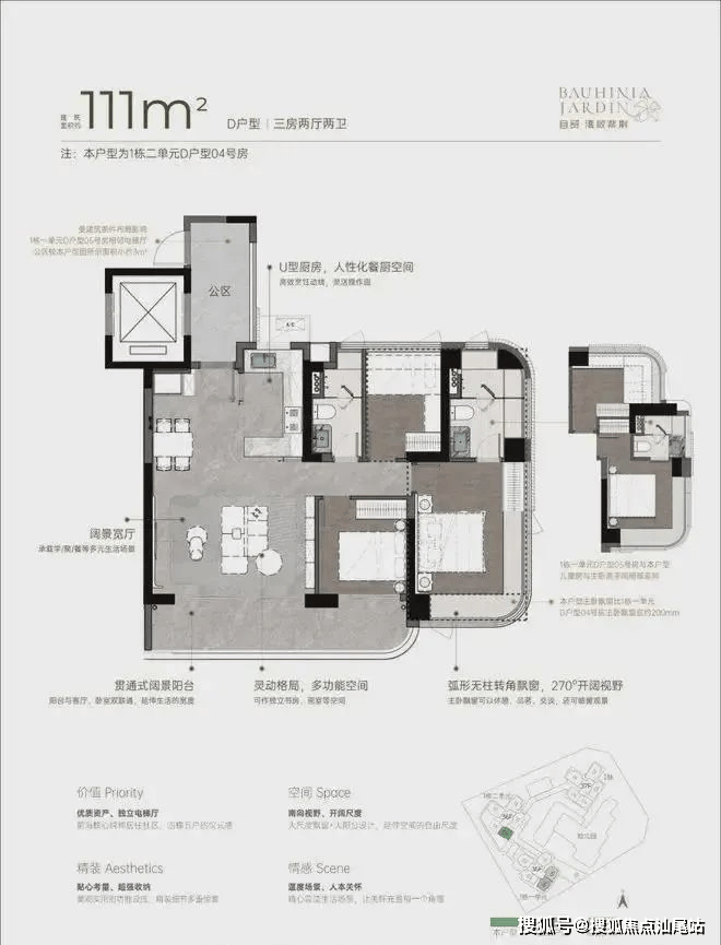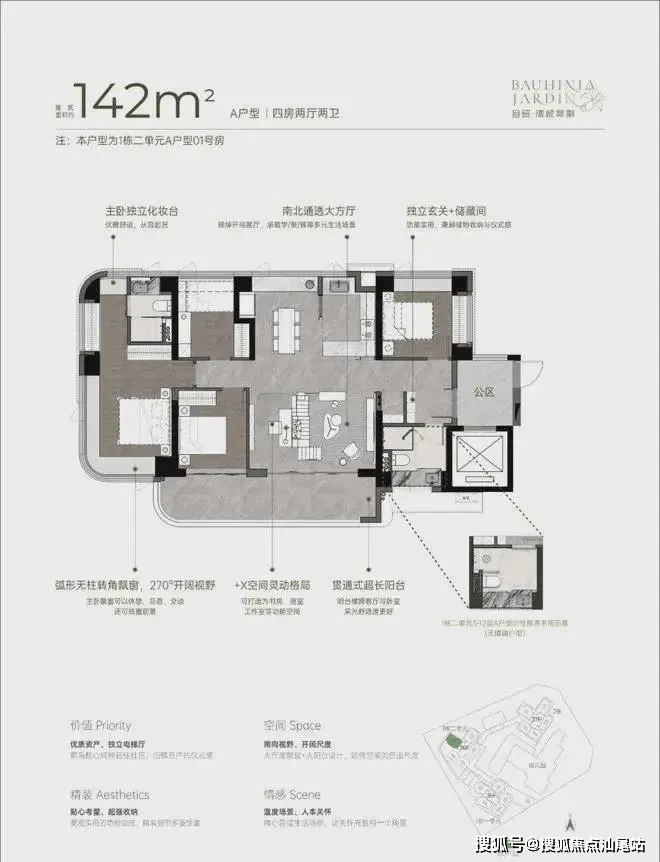 双龙抱珠户型,整个户型非常通透。书房分布于客厅另一侧,难得的双面采光+270°景观视野。主卧南北通透,景观面开阔。