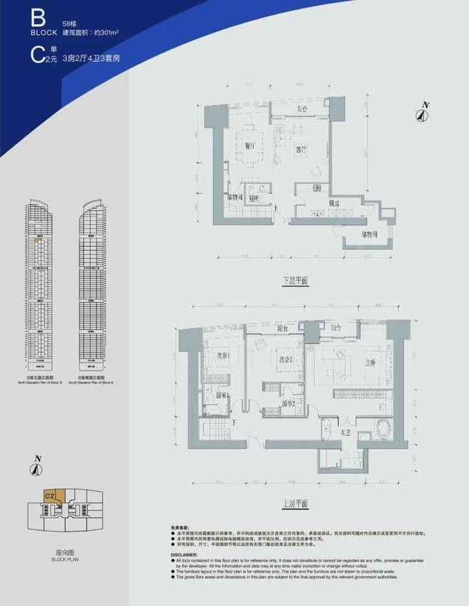 B座58层C2单元,建面约301㎡,3房2厅4卫3套房