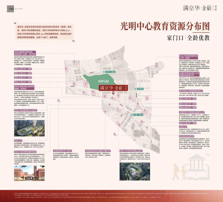 金硕臻府,由满京华集团开发,位于光明区光明中心区光辉大道与狮山三街交汇处,项目所在区域是光明规划最宜居,居住小区板块最大的片区,北侧靠近科学公园,东侧及南侧是深圳小学光明学校狮山校区及初中校区,距离最近的6号地铁线“光明站”约800米。