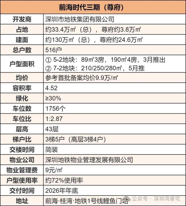 最新的消息:【前海时代三期】位于深圳市南山区前海合作区桂湾片区,梦海大道与桂湾四路交汇处、距离地铁1号线鲤鱼门站600米。项目2023年12月份首开55/56/57/60栋189-251平共270套,第二次开盘2024年3月推出53栋89/190平共344套,2025年4月份加推58栋242-244/281-283平大户型,备案单价10--12.9万,本次加推共171套53栋三单元89平159套和190平12套,备案总价873--2509万,单价9.7--13.2万。折后89平总价781万起,190平折后总价2200万起,样板房开放中,有兴趣联系后台预约,项目优缺点和户型图放在文章底部。