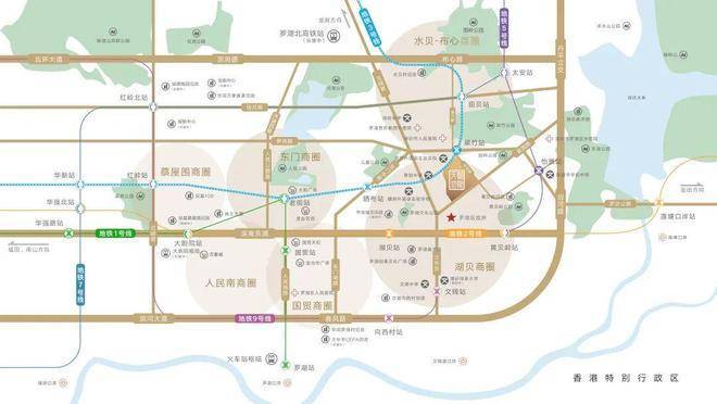 项目位于爱国路与华丽路交汇处,紧邻罗湖区行政中心,双地铁物业(3号线/24号线(规划中)翠竹站,25号线(规划中)木头龙站),6地铁环绕(1、2、3、5、24号线(规划中)25号线(规划中))。