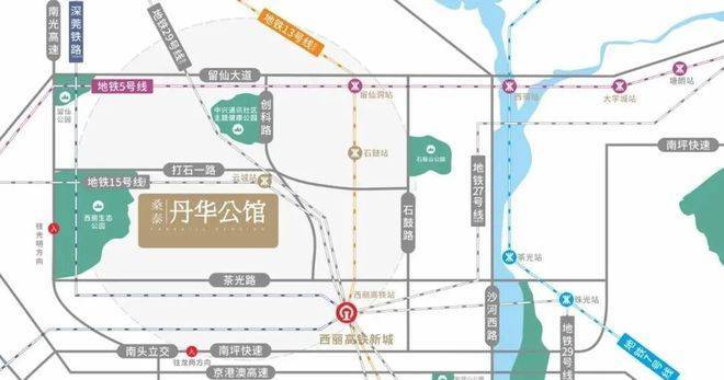 丹华公馆的区域优势显著,位于南山区的留仙洞片区,紧邻西丽生态公园和深中南山创新学校,同时位于留仙洞总部基地和西丽高铁新城片区内。这一区域交通便利,距离西丽综合枢纽站约2公里,未来还将有地铁15号线打石一路站(建设中)直线距离约400米,方便居民出行。此外,项目紧邻留仙大道、南光高速、南海大道、南坪快速等主干道,构建了多维城市路网,自驾出行也十分便利。