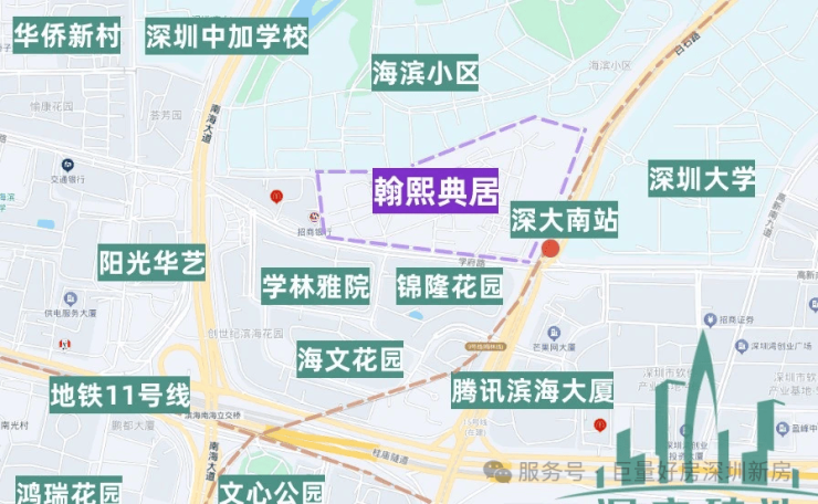 翰熙典居北面紧靠深圳大学粤海校区,南面是学林雅院和锦隆花园等二手小区,东侧是深圳大学沧海校区和一众科创产业。