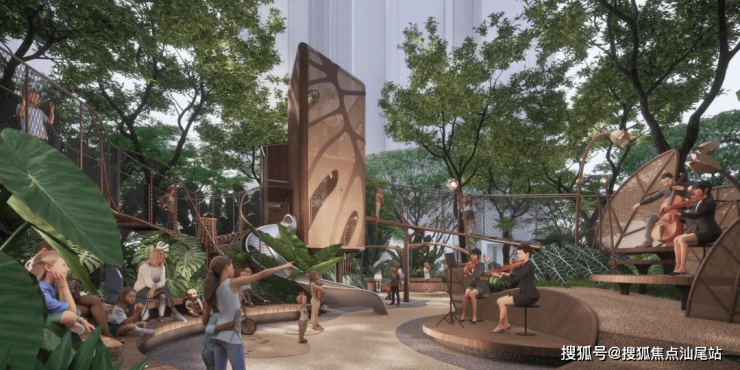 打造元气健身营地空间、自然水岸泳池、达尔文营地游乐场、流水庭院花园等四大主题花园