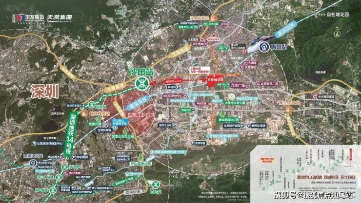 深铁14号线沙田站,家门口公交直达:家楼下公交站,M187公交8站直达沙田站;14号线接驳2、3、5、7号线,通达深圳各区,从容出行;