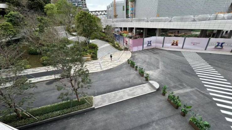 连廊的好处是可以省去业主通往周边(商业、公园等)的很多麻烦,不需要自驾,不受地面交通影响,站在廊桥看风景别有一番滋味,且廊桥本身也是城市的一道风景(下图是站在廊桥看一楼地面、公园和商业)。