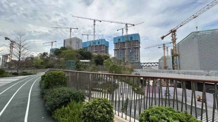 同时,项目还规划了3.6公里的空中连廊,串联5大公园、商业、住宅、办公、文化休闲和生态康养等多个特色主题环游路线。我去参观时,空中连廊已建好一部分,下图是从连廊看公园(左上角)和商业购物中心(右上角)。