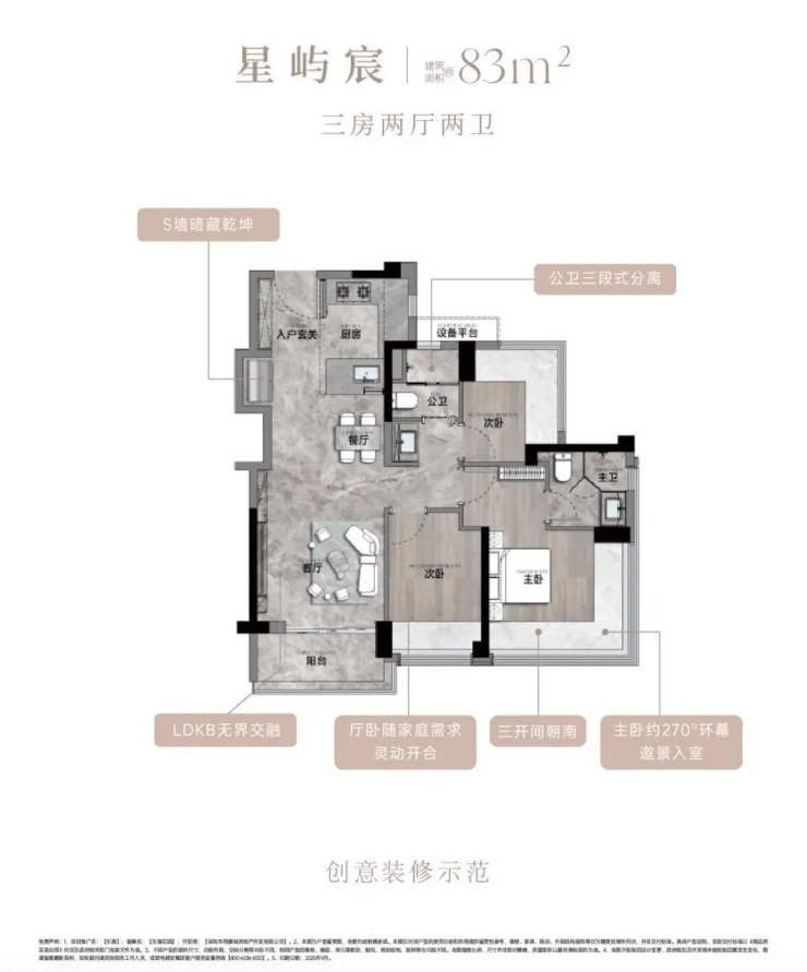 建面约83-133㎡3-4房宸式美学新著,LDKB巨幕方厅,跑道式景观阳台,小家化星级酒店主卧套房,270°环幕全景舱,客厅次卧无剪力墙灵动设计,实现超高实用率,每一户皆是颐安“超新一代作品”的匠心宣言。