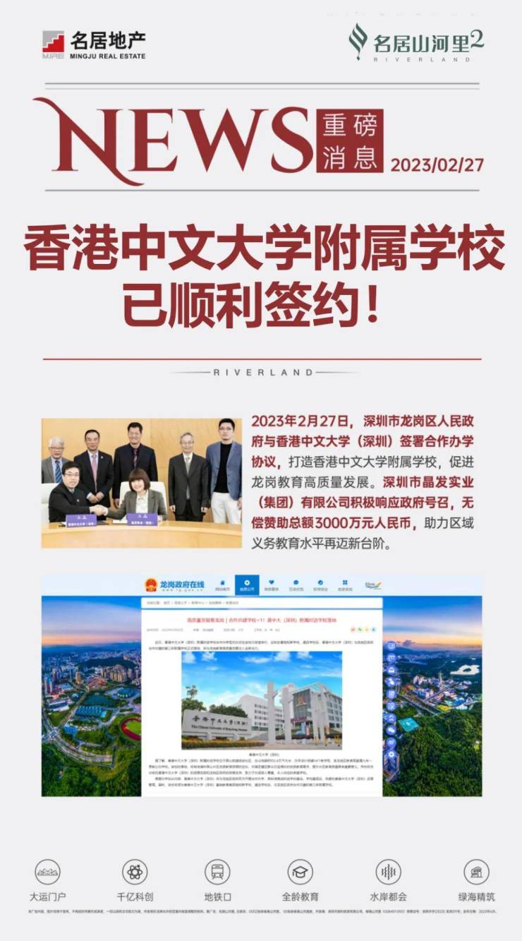 学校配套:名居山河里自带1所18班制幼儿园,家门口的香港中文大学(深圳)附属时进学校,该校是1所九年制公办学校,规划有54个教学班,也是香港中文大学(深圳)基础教育集团继大运的道远学校、知新学校之后,与龙岗区政府合作共建的第三所附属学校,在2023年的2月27日上午,香港中文大学(深圳)附属时进学校与龙岗区政府正式进行了合作办学签约仪式。
