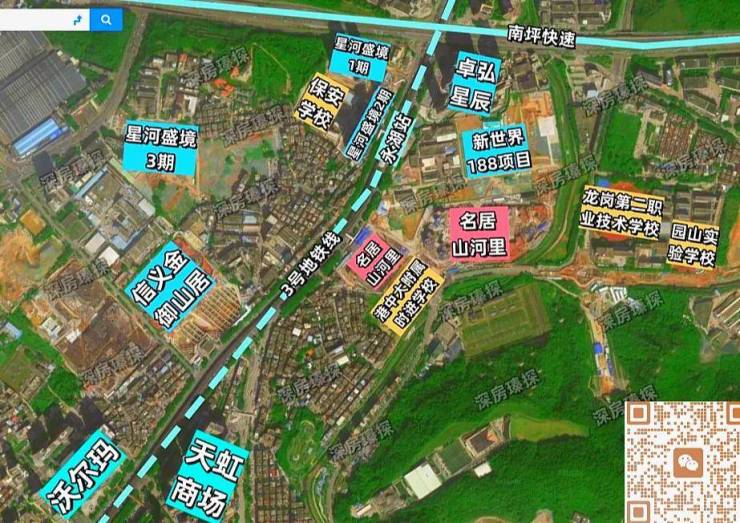 商业配套:名居山河里自带约2.7万㎡商业,周边还有新世界、卓弘星辰等社区商业配套,未来整体的底商氛围还是不错的,也可以坐地铁2站到大运,有目前龙岗中心城最高端的商业星河cocopark,1站到横岗,有沃尔玛、天虹商场、金沙摩尔、新世界广场等商业中心。
