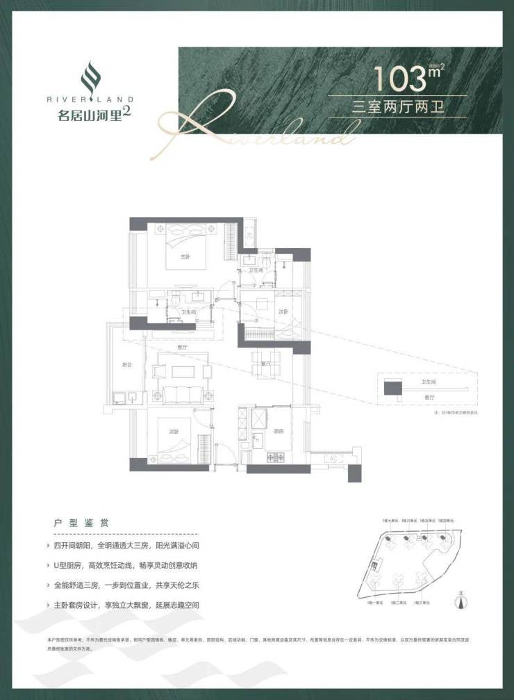 103㎡的3房2厅2卫(02户型),设计的是竖厅南北通透格局,客厅3.5米开间,四开间朝南,全屋飘窗,U型厨房,得房率:73.87%(不含赠送),阳台1.6米进深,主朝西南向。