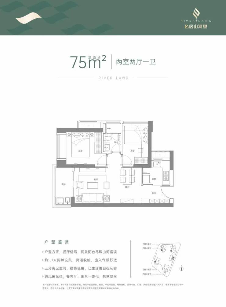 75㎡的2房2厅1卫,设计的是竖厅格局,客厅3.3米开间,LDKB一体化,2个卧室分别做到了主卧9.6㎡/次卧8.88㎡(套内面积,包含墙体),L型厨房,卫生间干湿分离,得房率:71.46%(不含赠送),阳台1.6米进深,西南朝向。