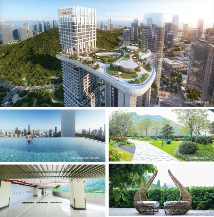 其中裙楼平台花园位于6F,设计了花园洽谈区、观海吧台、下沉会客厅、动静结合玩乐空间;云台则位于150米的高空,云集空中酒店、荧光跑道、无边际泳池等配套。