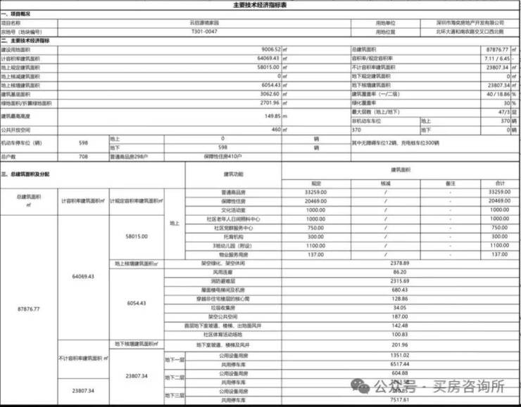 小区占地面积仅9006.52平米,共 3 栋住宅楼,其中2栋21-47层商品房住宅、1 栋 46层保障房。总户数708户,普通商品房298户,保障性住房410户。