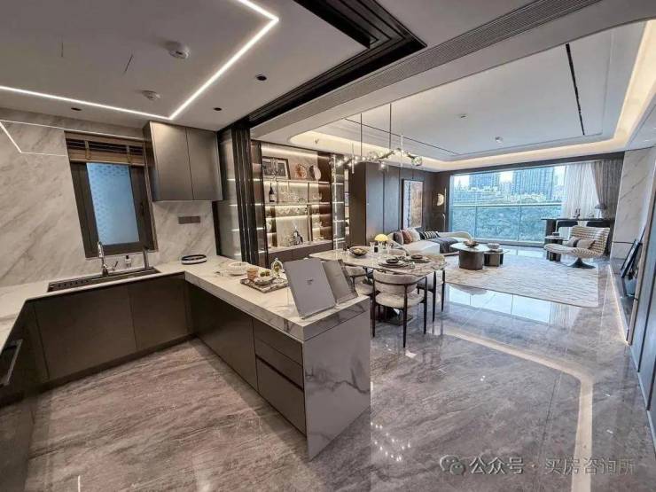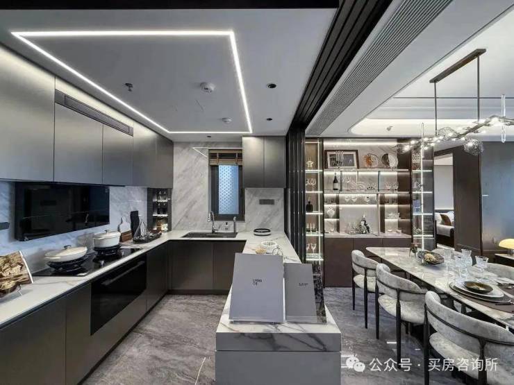 室内方面,进门的餐厨用了「深湾玖序」祖传同款的互动式可移动岛台,这种设计近年都比较火,平时亲友聚餐、做点心、包饺子等等的场景都可以贴合。