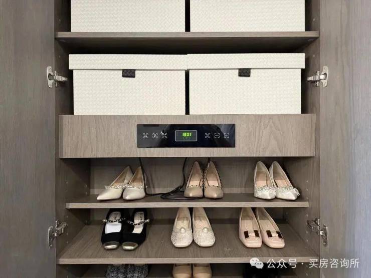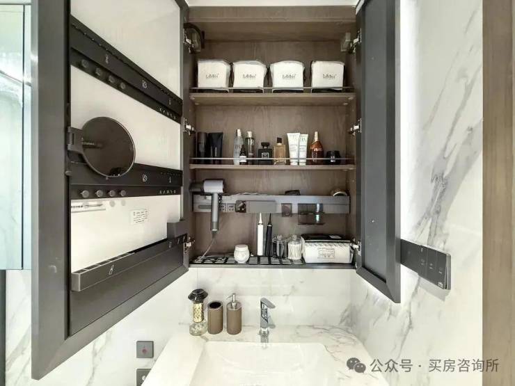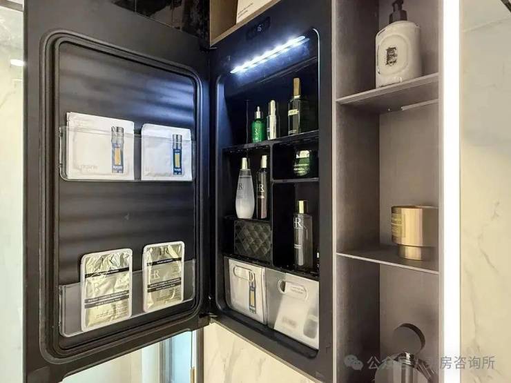 卫浴方面用了汉斯格雅、唯宝和杜拉维特,品牌定位也是相当凑合。另外主卫还配备了美妆冰箱,牙刷除菌的收纳柜。