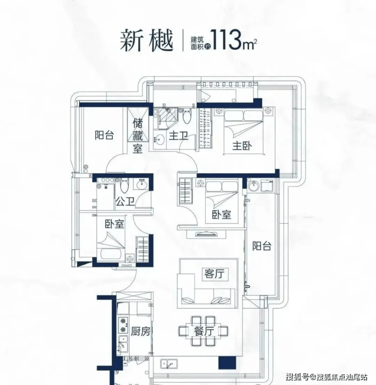 113㎡的4房2厅2卫,设计的是横厅南北通透格局,进门入户玄关,客餐厅一体化设计,餐厅位双飘窗无敌视野,全屋6个飘窗面,客厅连接次卧出5.6米长的巨幕大阳台,L型厨房带1个设备平台,卫生间干湿分离也带1个设备平台,得房率约94%(包含赠送),正东朝向。