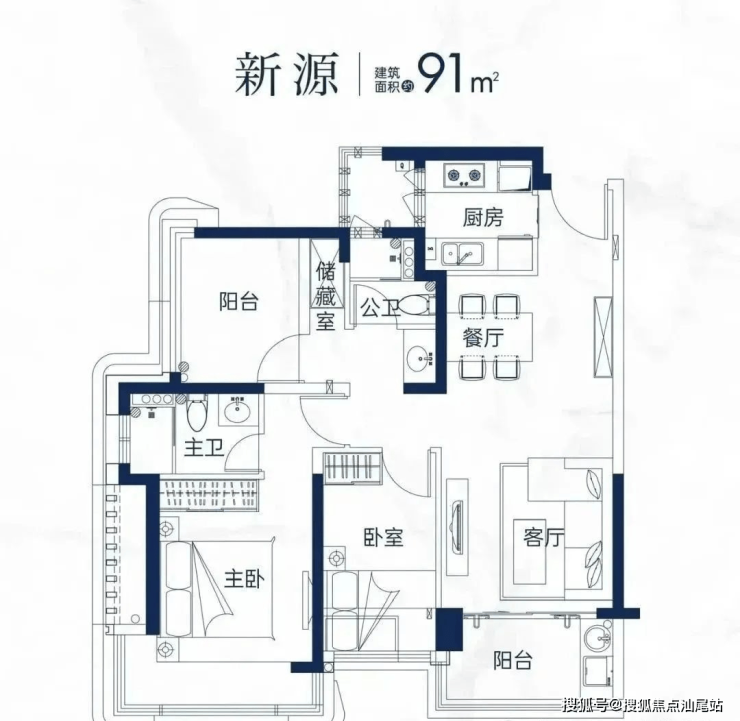 91㎡的3房2厅2卫,设计的是经典竖厅格局,进门入户玄关,客厅3.3米开间,LDKB一体化设计,动静分区,三开间朝南,主卧转角飘窗带1个设备平台,U型厨房,公卫三段式干湿分离,还带1个设备平台,得房率约89%(包含赠送),正南朝向。