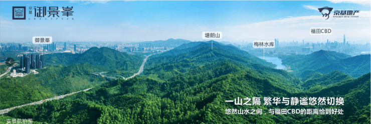 约15000亩(约1000万㎡)塘朗山绵延至此,连同西丽水库、长岭皮水库、塘朗山构成的公园群给项目带来得天独厚的山水景观资源。这里的绿化覆盖率居深圳第一,负氧离子含量是福田中心区的4倍。