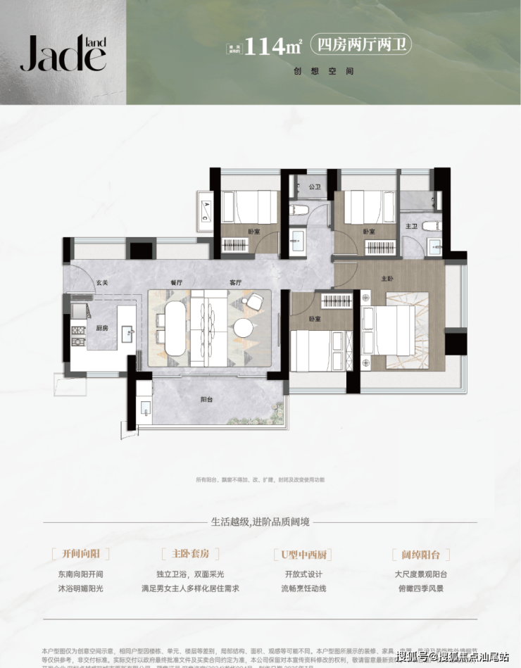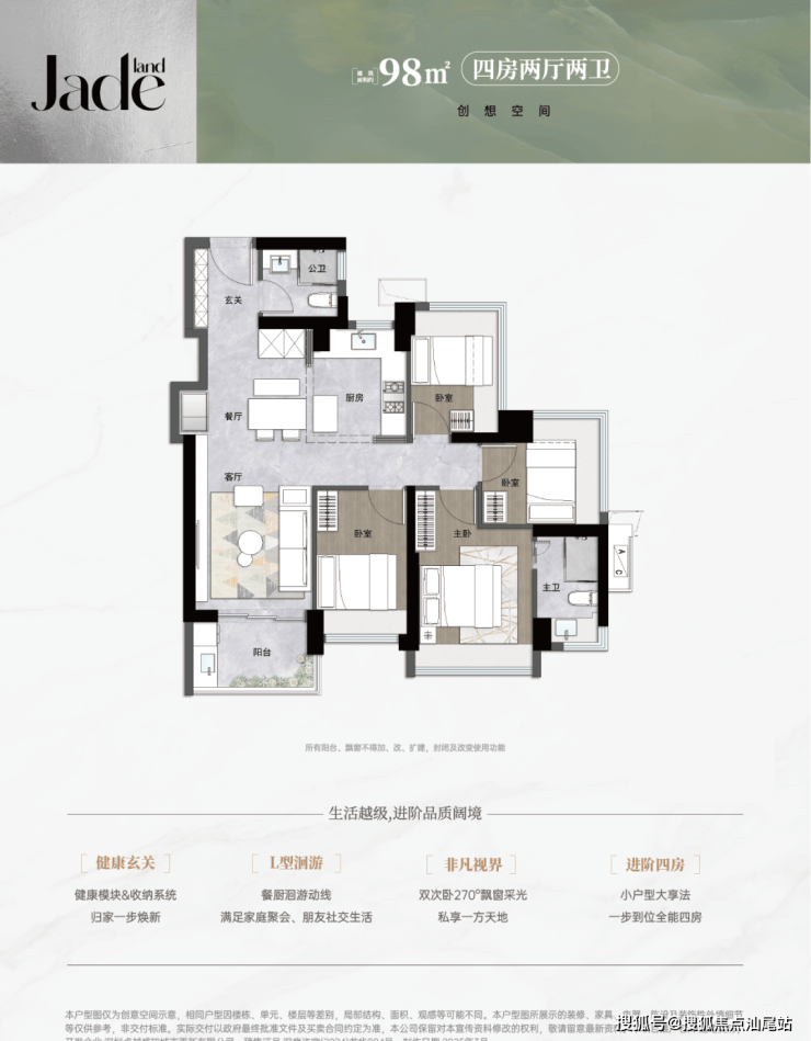 98-114㎡四房两卫(总价463万起):98㎡户型四开间朝南,可变空间满足多孩家庭需求;114㎡南北通透横厅设计,五开间朝南,全屋9面飘窗,主卧套间配置,适合改善型家庭。
