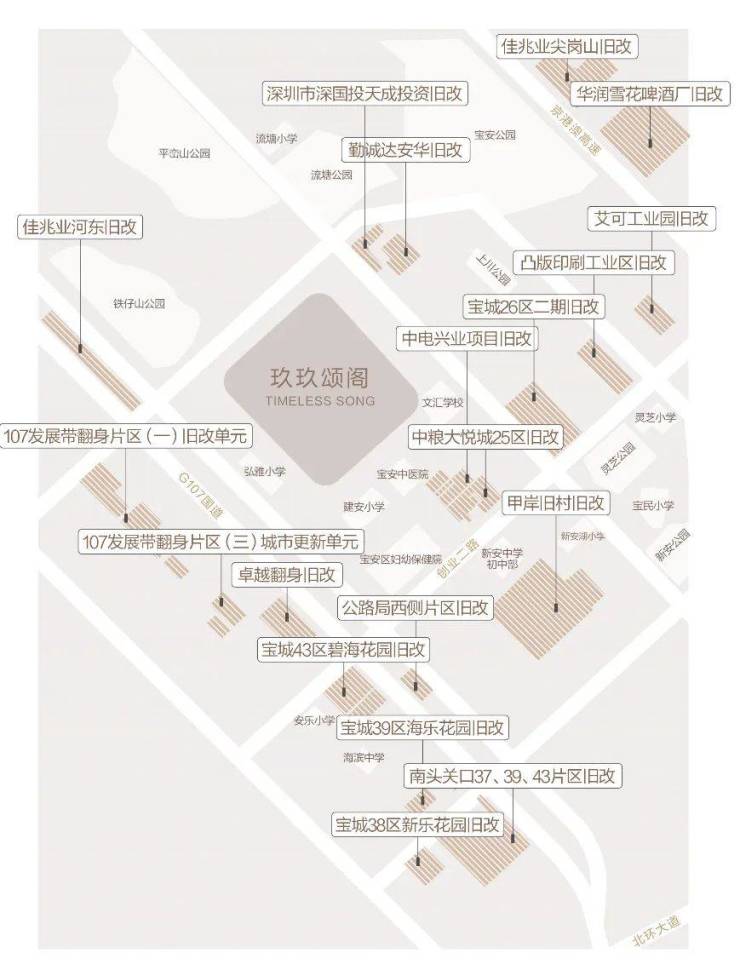 新安片区,尤其是在沿前进路正在进行着大规模的城市更新,分布着共20个旧改项目,超千万的旧改体量,相当于新安整个片区重建。仅我们项目2公里范围内就汇聚了8个旧改项目,分别是沃尔玛购物广场片区旧改、安华工业东区旧改,卓越翻身旧改、宝城碧海花园旧改、公路局西侧旧改、甲岸村旧改、宏发新领域、中洲中央公园二期。