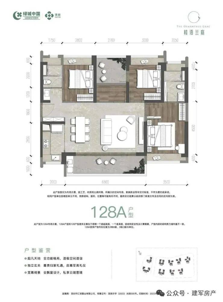 128㎡的4房2厅2卫(一期A户型),3栋B/C座05户型,设计的是横厅南北通透格局,客餐厅6.8米开间约30.6平,LDKB一体化,分别做到了主卧17.85㎡/次卧11.4㎡/次卧10.64㎡/次卧10.26㎡(包含墙体飘窗),U型厨房,公卫三段式分离设计,得房率:75.2%(不含赠送),阳台约11.56㎡西南朝向。套内面积97.5㎡+赠送面积16.61㎡=实用面积114.11㎡,加上赠送后得房率约87.99%。