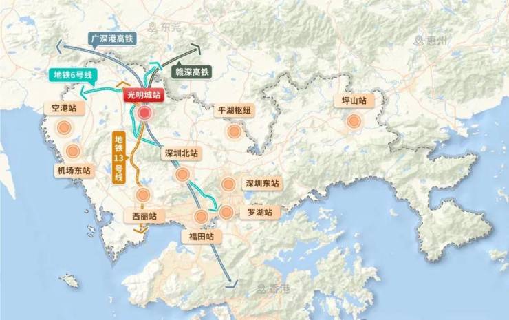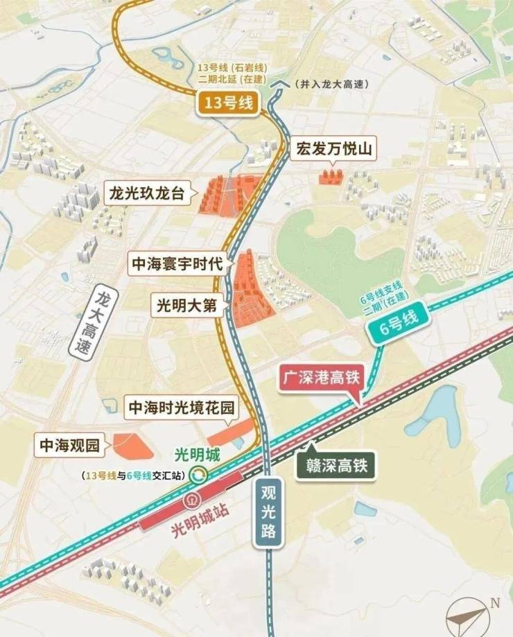 距离在建的13号线同观路站约600米,去光明城站(高铁+地铁站)步行约500米,未来地铁去南山很便捷,出门就是主干道观光路,尅可以很快转上光明大道驱车前往中心区。