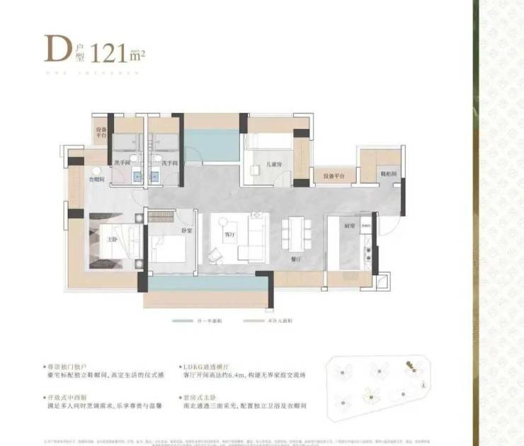 【121㎡的4房2厅2卫】:设计的是横厅南北通透格局,进门赠送约4.2㎡的前室入户,独门独户,客餐厅6.35米开间,4个卧室分别做到了主卧21.37㎡/次卧10.22㎡/次卧10.19㎡/次卧7.39㎡(实测面积,去掉墙体),主卧+1个次卧270°飘窗,客厅连接次卧出6.3米长大阳台,L型厨房,得房率约79.45%(不含赠送),阳台主朝西南或东南向。