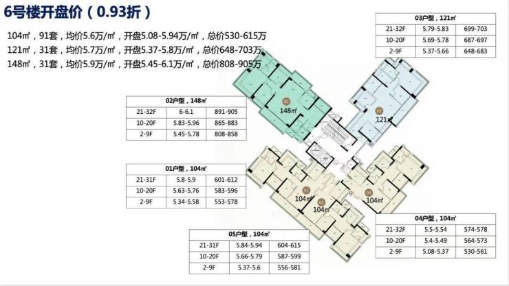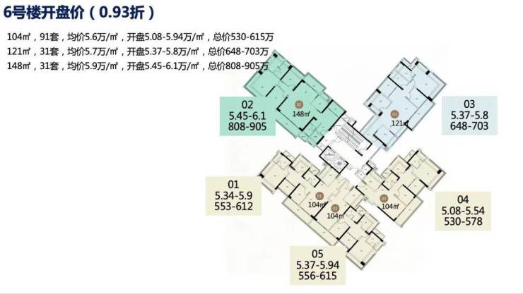 约104㎡,91套,均价5.6万/m,开盘5.08-5.94万/m,总价530-615万。