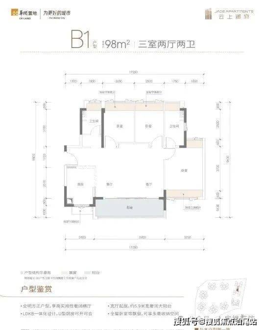 B3户型:MAX方厅设计,客厅4.9米开间,LDKB一体化+X全场景,得房率83.95%,西南或东南朝向。