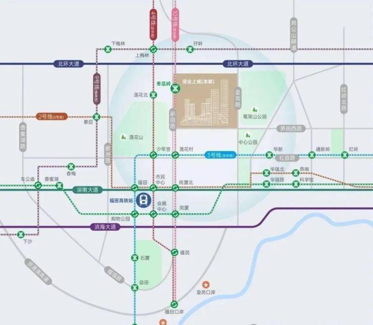 无缝接驳地铁10号线冬瓜岭站,纵享福田“一中枢、双口岸、四核心”枢纽体系,再造引桥匝道升级微循交通体系,高效互联湾区城市与全球资本。