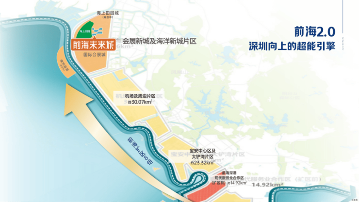 前海8倍扩容,宝安形成“南宝中、北会展”双中心发展格局。从前海1.0(妈湾、前湾、桂湾片区)到前海2.0(会展海洋城),多重战略加持下,成为深圳向上发展的核心引擎。