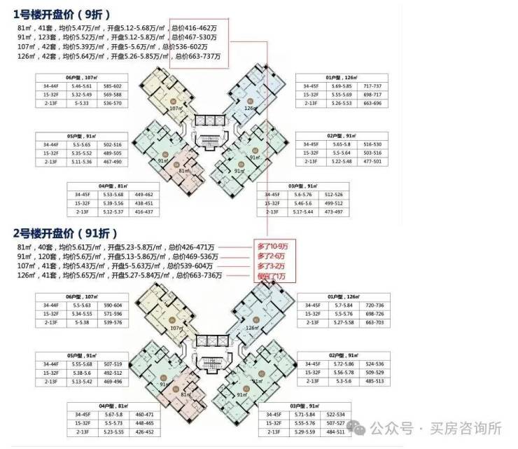 据了解跟之前3-5栋户型一样,有81-91㎡3-4房,还有107㎡-126㎡横厅四房户型,共248套,其中81的户型仅41套,91㎡是主力军123套,107跟126横厅四房各42套,相比之前3-5栋105-124平米,1栋2栋会大2㎡,不过户型是一样