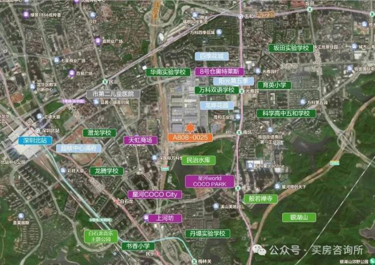 项目距离地铁10号线南坑站约700米,周边有华南实验学校,8号仓奥特莱斯、星河cocopark等商业综合体