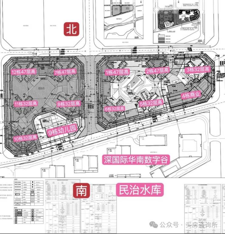 项目分为两期开发,从设计图可以看出,项目共分为东西两个地块建设,中间规划一条市政路,采用点阵式布局,10栋超高层塔楼围合组成,部分户型南向可看民治水库景观。
