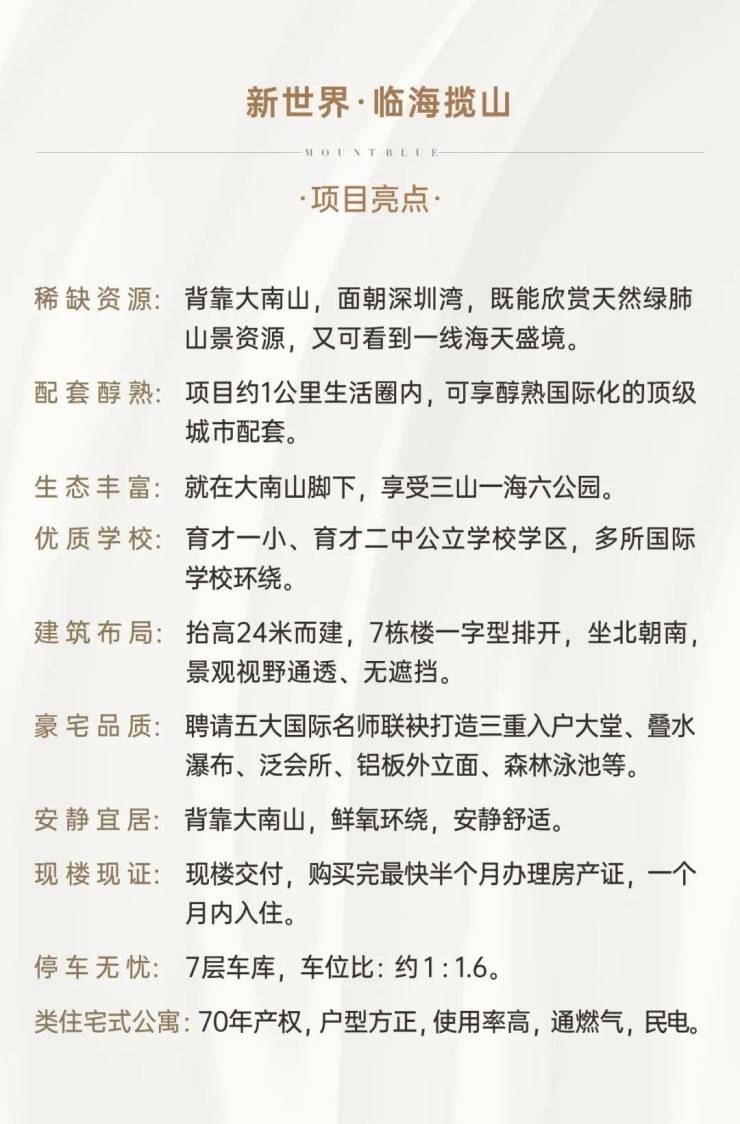 新世界·临海揽山位于南山蛇口半山传统豪宅区,属四区叠加的传统豪宅区,三面环山、正面瞰海,拥有丰富的城市配套、稀缺的山海资源以及名校学区,项目聘请五大国际名师以顶级豪宅标准打造,目前已是现楼,即买即办证即入住。
