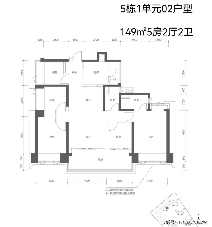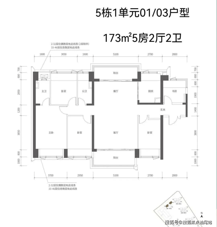 【五栋一单元-平面图】3梯3户,3条腿,分别是01、03号房户型约173㎡的5房2厅2卫、02号房户型约149㎡的5房2厅2卫