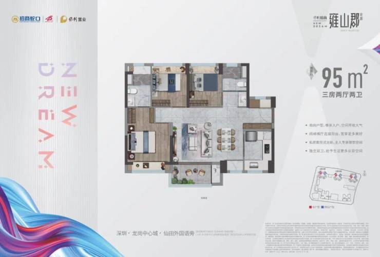 龙岗新生,保利招商雍山郡于2022年9月16日取证入市,本次推出1栋A/B/C座,共748套房源,面积69㎡的2房2厅1卫,85㎡的3房2厅1卫,96㎡的3房2厅2卫户型,备案均价3.91万/㎡,备案单价3.65-4.1万/㎡,总价265-386万/套区间,现房精装交付。
