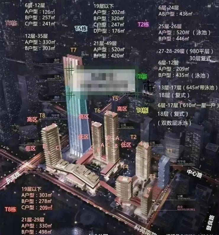 南区分为:T5、T6、T8公寓,T7为环球商务中心。