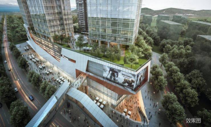 【办公体】:办公和商业空间灰色气质,办公楼折线开口设计使大面积的玻璃立面生动活泼且具有现代感;竖线条更加突显建筑的高耸挺立。