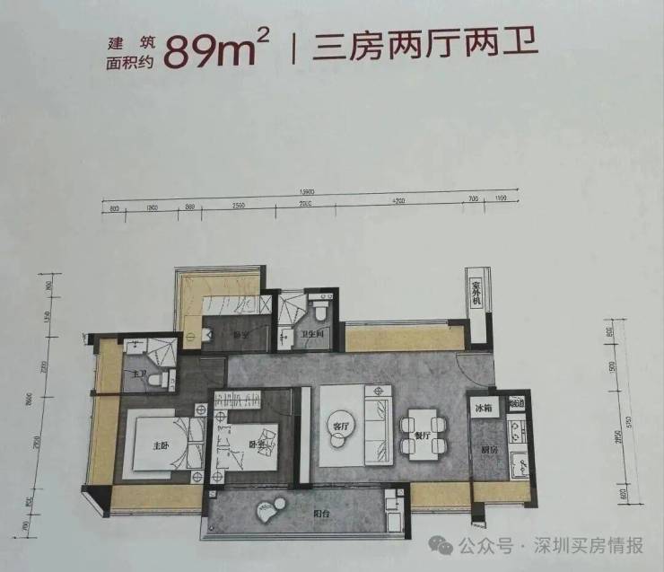 89㎡的3房2厅2卫,设计的是竖厅格局,客厅3.4米开间,LDKB一体化,S墙设计预留冰箱卡槽位,3个卧室分别做到了3.9米/2.9米/2.6米的宽度,客厅连接次卧出6.3米长的大阳台,L型厨房,卫生间干湿分离,有西北、西南或东南朝向。