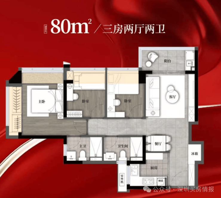 80㎡的3房2厅2卫,设计的是竖厅格局,客厅3.3米开间,LDKB一体化,S墙设计预留冰箱卡槽位,3个卧室分别做到了3.65米/2.55米/2.45米的宽度,L型厨房,卫生间干湿分离,有朝东北向或正东朝向。