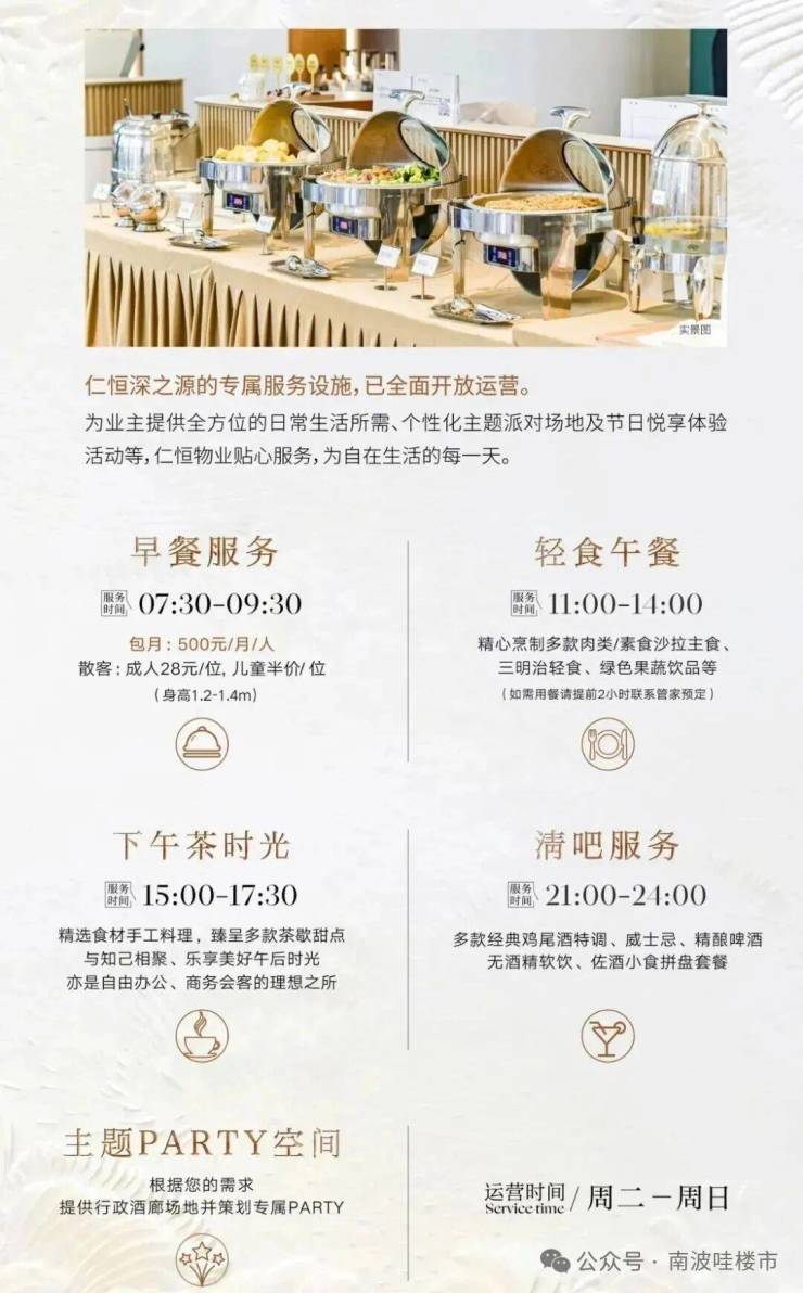 ◎优雅逸境行政酒廊,以“开放式设计+订制化服务”的运营理念,构建“圈层社交+个人私享”的全新体验,提供自助早餐(500元/月)、轻食午餐预定服务,供业主及来宾悠享,全天候多为社交场景+户外露台,可预约包场定制主题派对等专属生活场