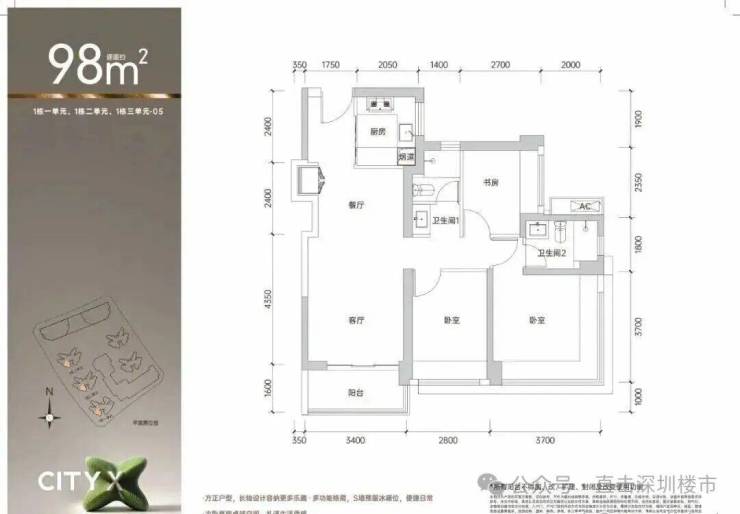 98㎡的3房2厅2卫,1栋1/2/3单元03.05户型/3栋的98平户型,设计的是经典竖厅格局,进门入户玄关,客厅3.4米开间,LDKB一体化,S墙设计预留冰箱卡槽位,三开间朝南,动静分区,3个卧室分别做到了主卧14.3㎡/次卧10.36㎡/次卧6.75㎡(包含墙体飘窗),U型厨房,公卫三段式分离,得房率约74.6-75.4%(不含赠送),东南或西南朝向。套内面积74.09㎡+赠送面积11.13㎡=实得85.22㎡,加上赠送后得房率约86.96%。