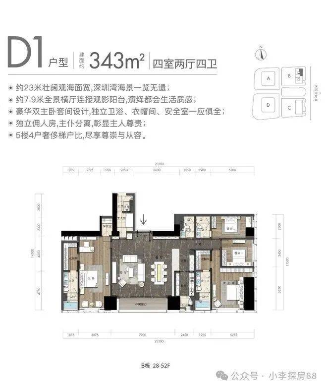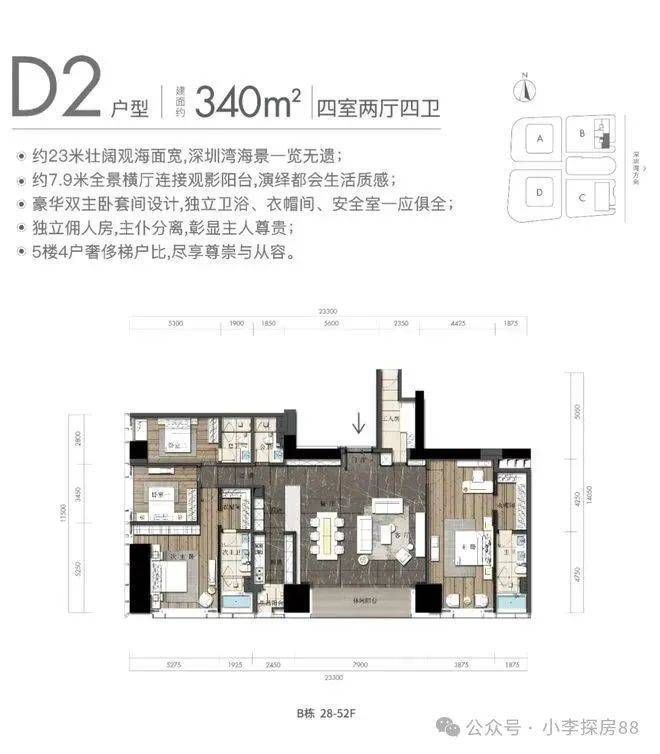 观景阳台:高区340平米户型,东面23米宽无敌海景视野(塔楼总观景面约46米)