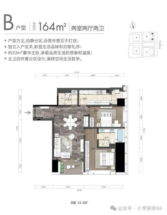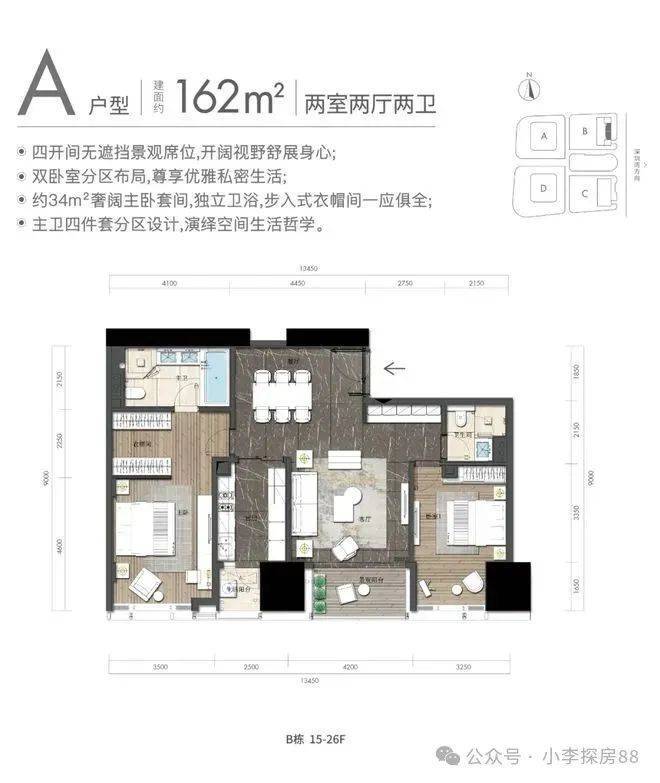 如:最低门槛户型1房为62-72平,2房户型为162/164平;