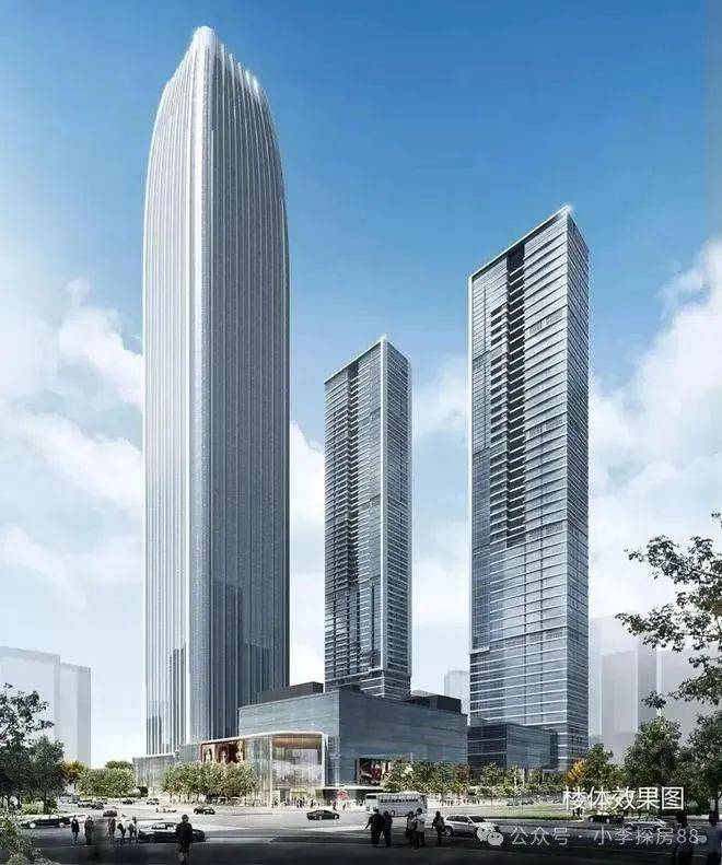 项目占地面积约2.5万㎡,总建面约41万㎡, 由三栋超高层建筑以及下沉式商业组成,其中写字楼高度约310m,公寓高度约255m,是集超甲级写字楼,顶级公寓,都会商业(约8万㎡)等业态于一体的超级综合体。