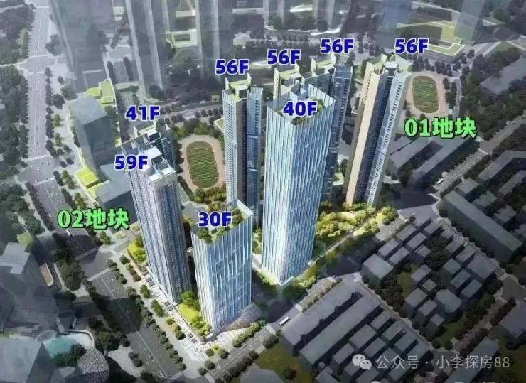 01-01地块占地约1.93万平方米,总建筑面积约23.8万平方米,容积率为8.81,绿化率为40.01%。该地块由1栋40层的办公单元和4栋56层的住宅单元,还规划有公交首末站。地块总规划980户,住宅单元设计为3梯4户、3梯5户和3梯6户,规划停车位1533个。