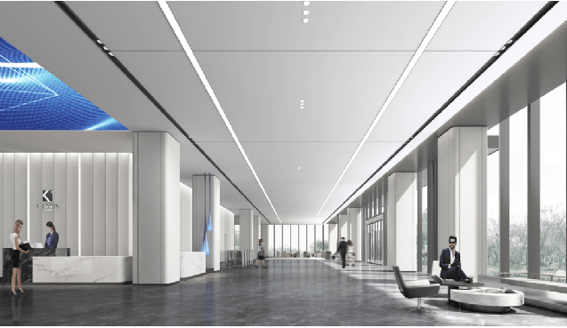 大堂高约9.9米,双LED巨型屏幕,高端干挂石材打造,全铝板核心筒,塑造高雅企业商务形象。