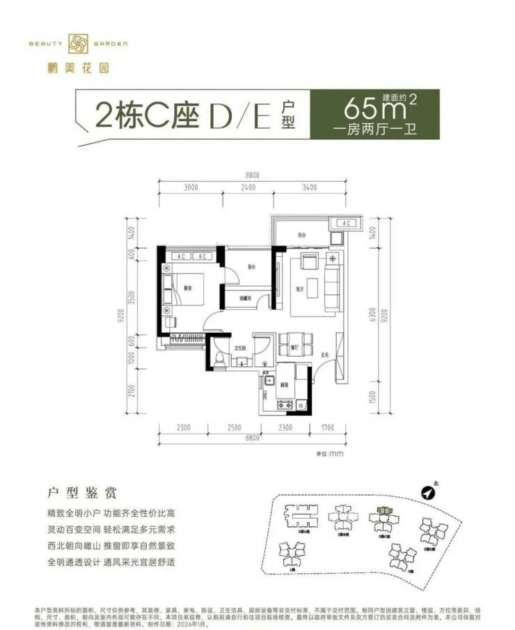 65㎡的2房2厅1卫,设计的是竖厅格局,得房率约92%(包含赠送),阳台约4.7㎡西北朝向。